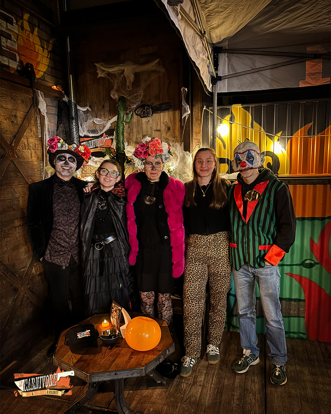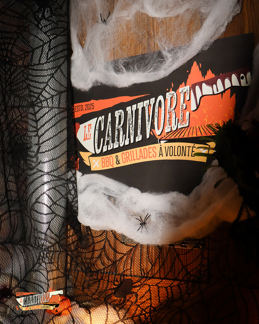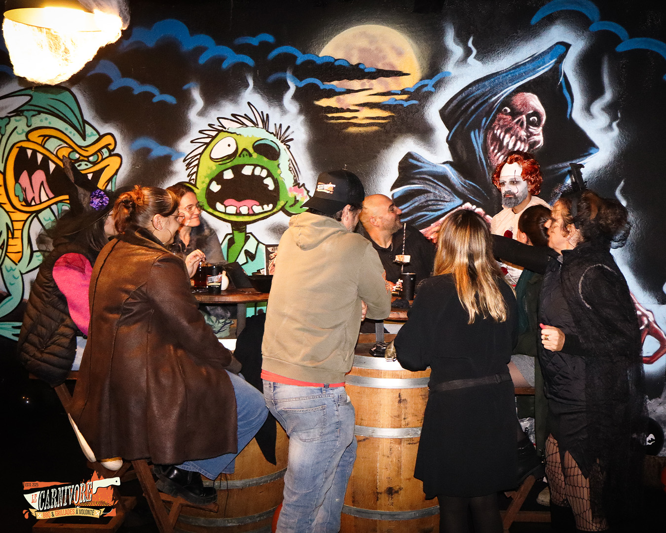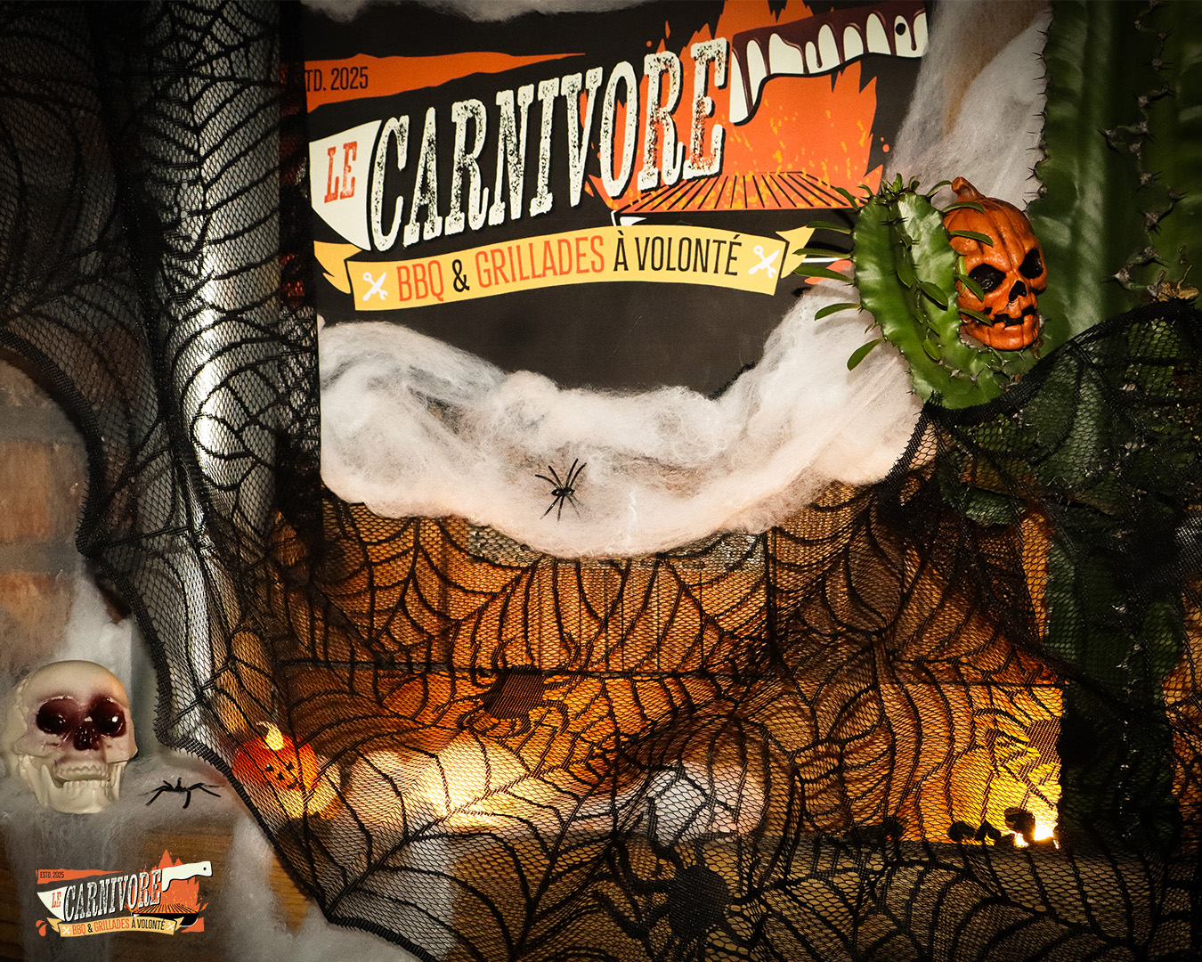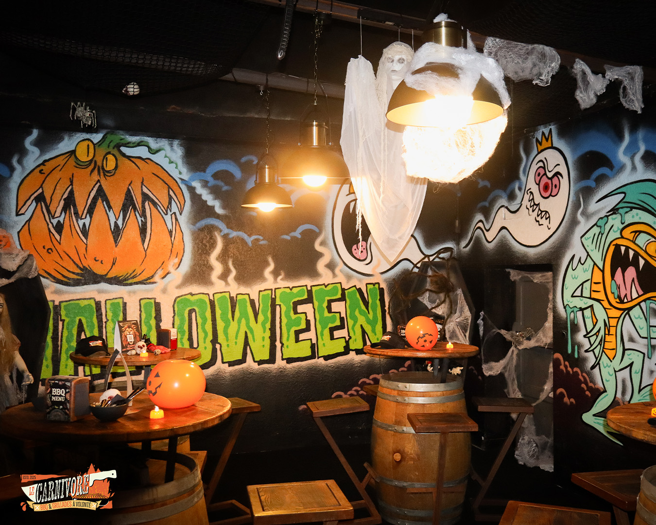 C’est une soirée spéciale Halloween au Carnivore, où la braise rougeoyante rivalise avec les flammes des citrouilles sculptées. Entre les côtes de bœuf fumantes et les effluves de barbecue, une étrange légende circule : on dit qu’un mystérieux « maître du grill » rôde chaque année pour vérifier la cuisson… des âmes égarées. Le jeudi 30 octobre 2025, vous nous avez livré une soirée carnivore sanglante, où la viande était saignante à souhait et les frissons garantis ! Retrouvez les souvenirs de ce moment exceptionnel ci-dessous.